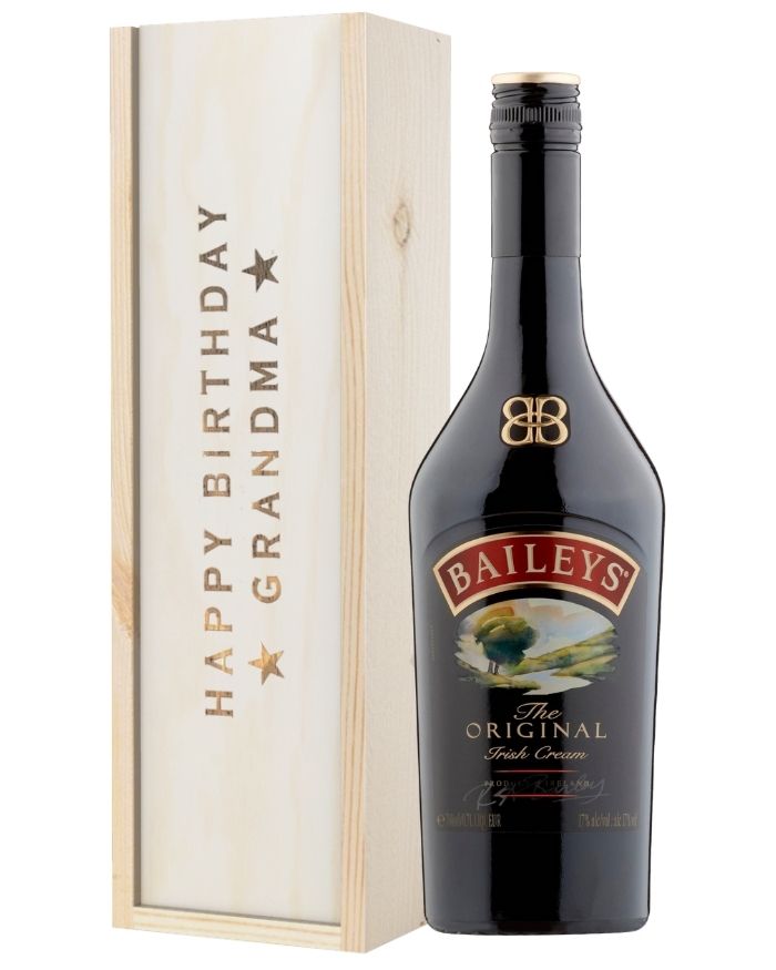 A stylish and one-of-a-kind way to say Happy Birthday to your favourite grandma this year. Featuring amazing flavours, extraordinary quality and a sophisticated look; this Baileys Birthday Gift Box for Grandma is made to stand out from any other gift she’s ever received before. Delivered in a solid wooden gift box lined with wood wool to ensure truly secure delivery, this gift set includes a single bottle of Baileys Original Irish Cream that your grandma is certain to enjoy every sip of. Simple to customise with a personal message from you as well if desired, this gift box features the words Happy Birthday Grandma on top so she can instantly see why she has received such an elegant gift.