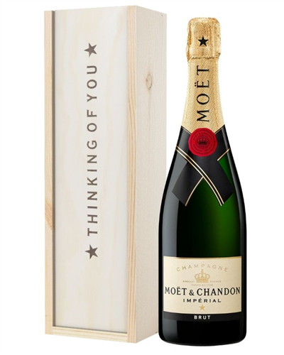 An exclusively crafted way to surprise someone in your life that deserves something special to enjoy; this amazing gift set includes a single bottle of Moet & Chandon Champagne that features nothing but scrumptious and bold flavours unlike any other. Delivered in a sturdy wooden gift box with the words ‘Thinking of You’ on top, this gift set also boasts a truly protective wood wool lining that ensures it can be securely delivered to any location for anyone to enjoy. Simple to customise with a personal message from you as well, this Champagne Thinking of You Gift Box makes any recipient feel as appreciated as they’ve ever felt before.