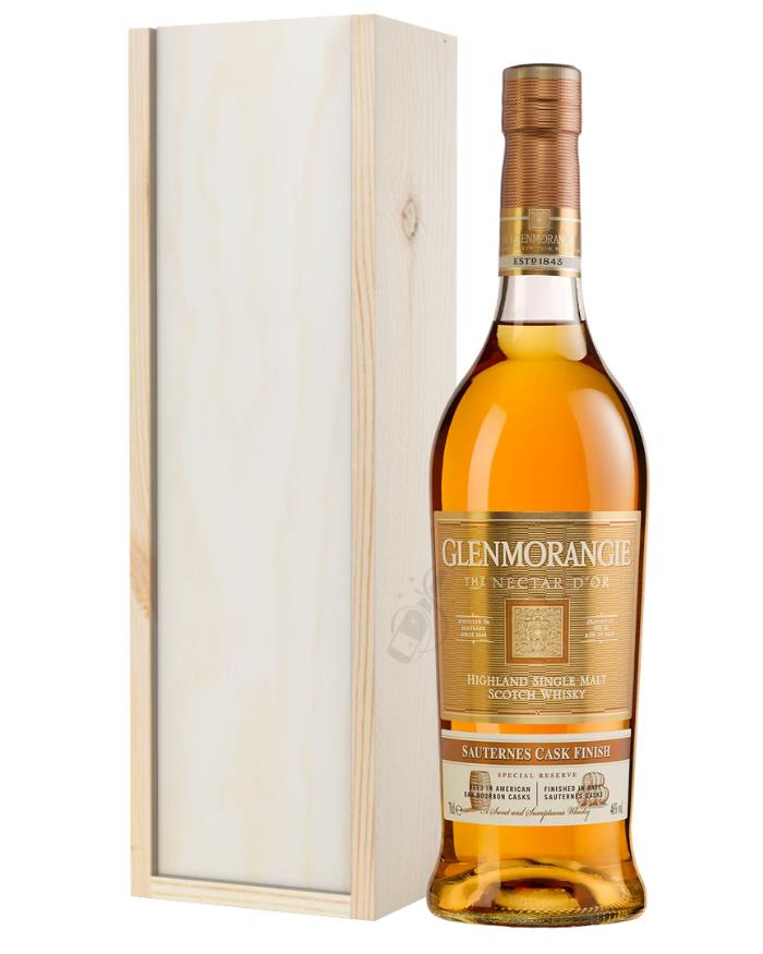 An elegant and high-quality gift box that is the perfect addition to any event from a retirement party to a birthday celebration and beyond; when you have one of these Glenmorangie Nectar Dor 12-Year-Old Highland Single Malt Scotch Whisky Gift Boxes delivered, you can be certain any recipient it’s sent to will be thrilled to savor every drop. Presented in a solid wooden gift box lined with wood wool to ensure secure delivery as well, this chic and gorgeous gift box will fill anyone with absolute warmth, whether you’re having it sent to a friend, aunt, cousin, nephew or co-worker to enjoy. Personalise this box with a message from you and easily send your warmest greetings, thanks or congratulations to anyone you choose.