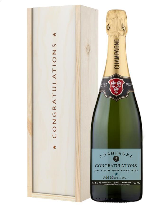 This personalised bottle of Champagne is the perfect way to congratulate the parents on the birth of their new baby boy. You can add your own words to the label of this Paul Langier Brut Champagne and it will be delivered in our classic wooden gift box with the words 'Congratulations' printed on the sliding lid. You can also add a gift card message which we will include with the bottle in the box and there is an option during checkout to purchase a baby boy helium balloon. Select the date of your choice or choose next-day delivery in the UK.