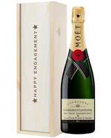 Personalised Moet & Chandon Champagne Engagement gift. Say Congratulations and share your happiness by sending the newly engaged couple a single bottle of Moet & Chandon Imperial Brut to enjoy on your behalf. Personalise the label letting them know who sent them this special gift or by adding the date of the engagement. This gift is delivered in one of our classic wooden boxes with the words ‘Happy Engagement’ printed on the lid. You can also add a personal written message which will be printed onto a card and inserted in the box. Have it delivered either the next day or on a date of your choice and this will be the best engagement gift they receive!