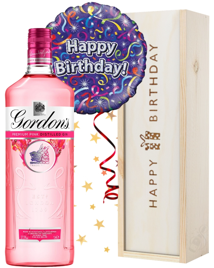 A unique and delightful pink gin gift box that is certain to make any birthday special from the moment it arrives. Containing a 70cl bottle of Gordons pink gin which has the taste of Gordons balanced with the sweetness of Raspberry, Strawberry and Redcurrant. Beautifully presented in a gorgeous wooden box and crafted with the words ‘Happy Birthday’ emblazoned upon the sliding lid and a delightful 18-inch happy birthday helium balloon as well. Easy to personalise with a message from you to make it clear who is sending their best birthday wishes.