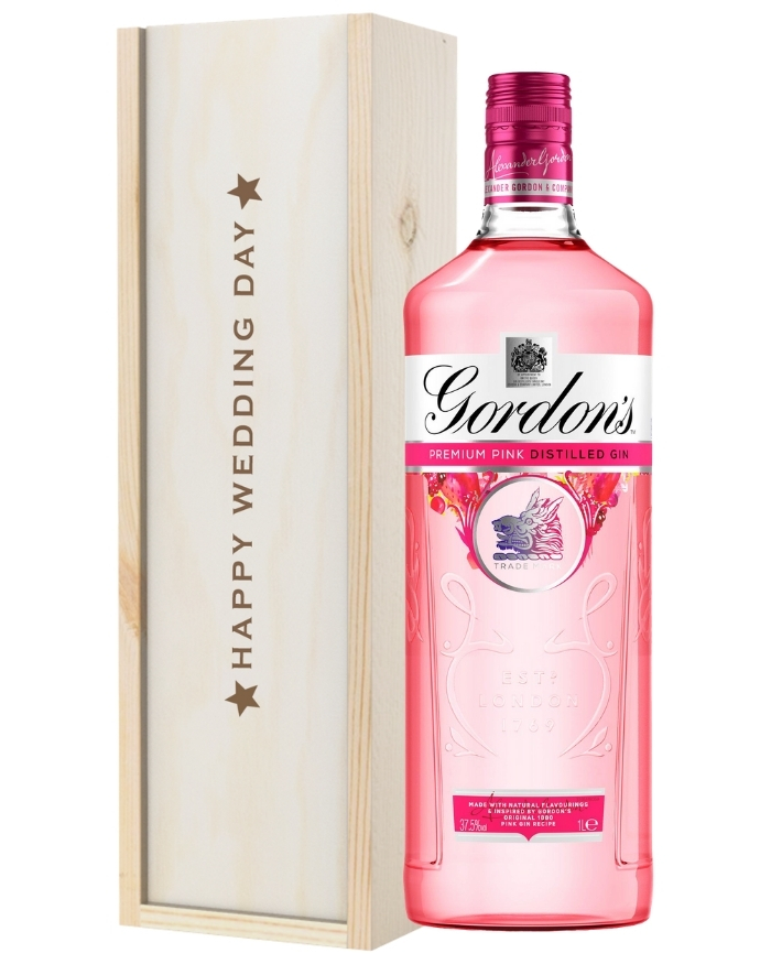 Extend the happy celebrations for the newlyweds with this fun and fruity Pink Gin wedding gift. Give something a little different yet just as delicious with a single bottle of Gordon’s Premium Distilled Pink Gin included with this gift. Easy to personalise, you can add a message to say congratulations. Plus, it comes presented in one of our ‘Happy Wedding Day’ wooden gift boxes, lined with wood wool for style and protection. It’s the perfect gift for any newly-married Gin-lovers! Have it delivered straight to their door with next-day or selected date delivery anywhere in the UK. There is no Gin wedding gift more fruity than this one!