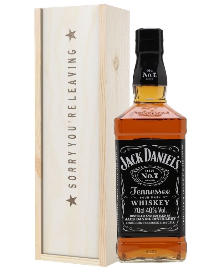 Delicious in flavour and fashionable in form, this Whiskey Sorry You Are Leaving Gift Box comes in a solid wooden gift box and includes a single bottle of Jack Daniels Old No. 7 Tennessee Sour Mash Whiskey within it to enjoy. Easy to personalise with a message from you if desired, this gift set is absolutely certain to make a statement, no matter who, or where, it’s delivered to. Beautifully branded with the words Sorry You’re Leaving on top and lined with wood wool all throughout the inside, this gift box offers unmatchable class and sophistication that no other present option on the market can match.